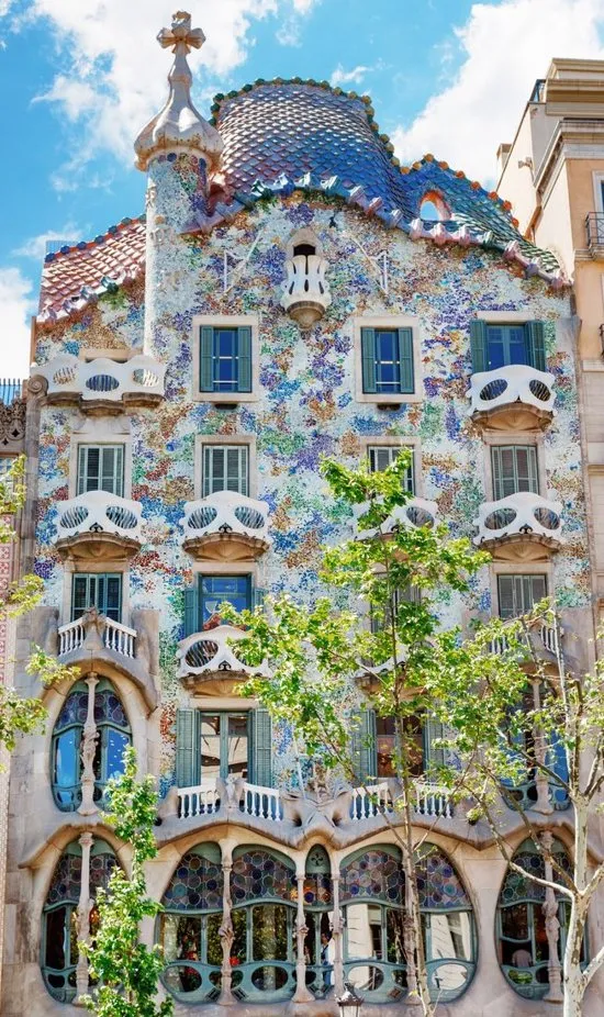 Originalmente construida en 1877 por Emilio Sala Cortés, Gaudí la remodeló entre 1904 y 1906 por encargo de Josep Batlló, un industrial textil. Gaudí transformó completamente la fachada, redistribuyó las paredes interiores y amplió el pozo de luz para maximizar la iluminación natural. El uso de *trencadís*, un mosaico de azulejos de cerámica rotos, adorna gran parte de la fachada, creando un juego de colores vibrante.